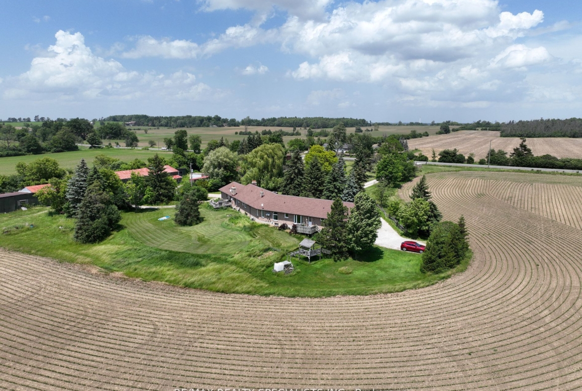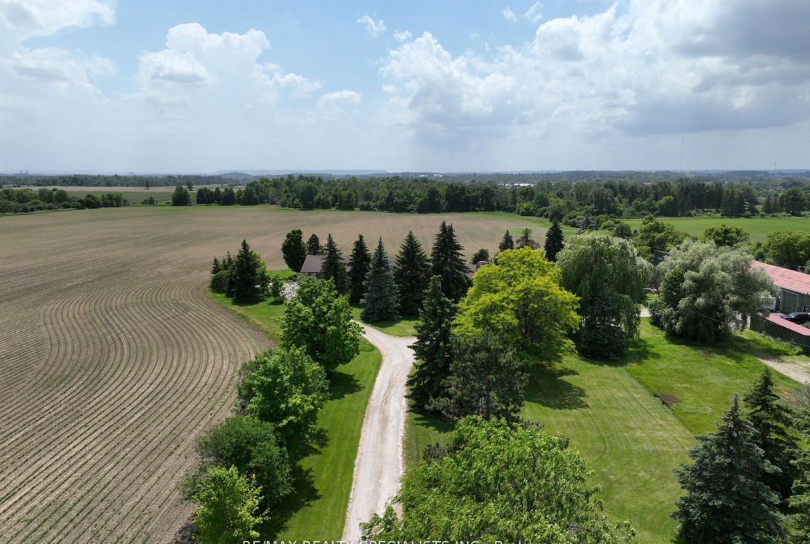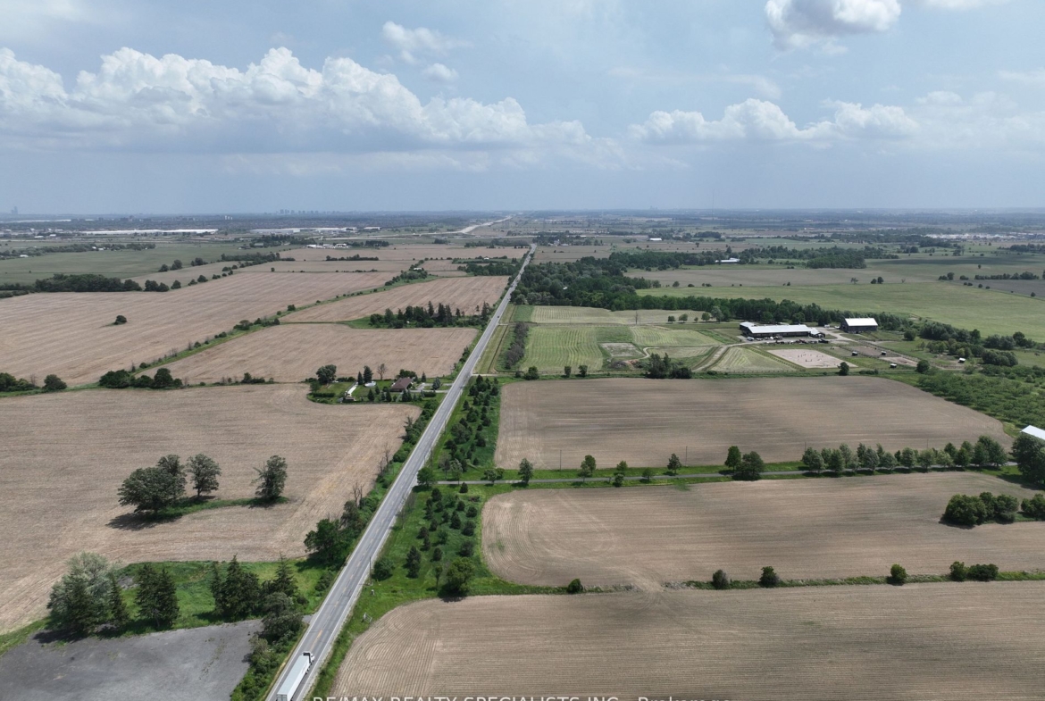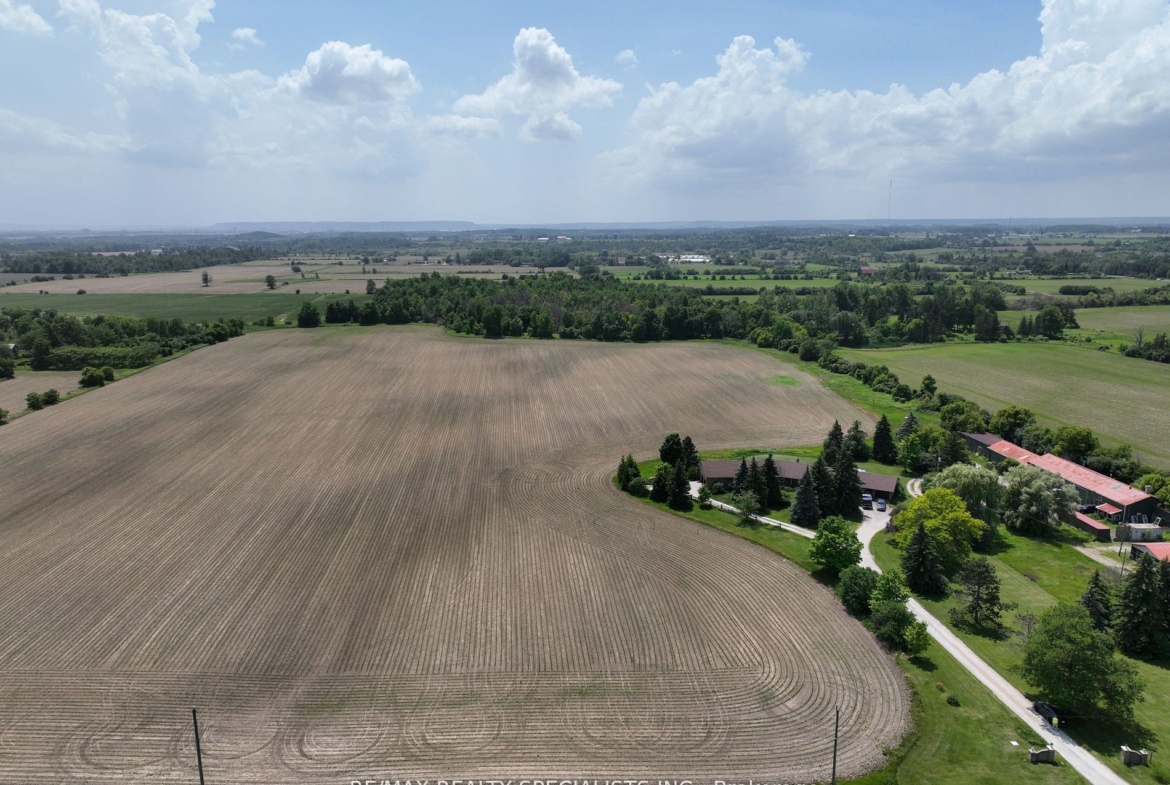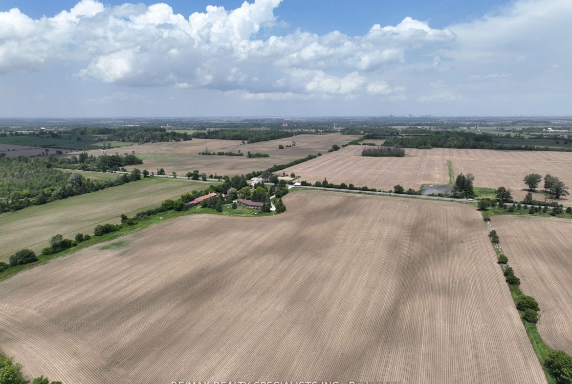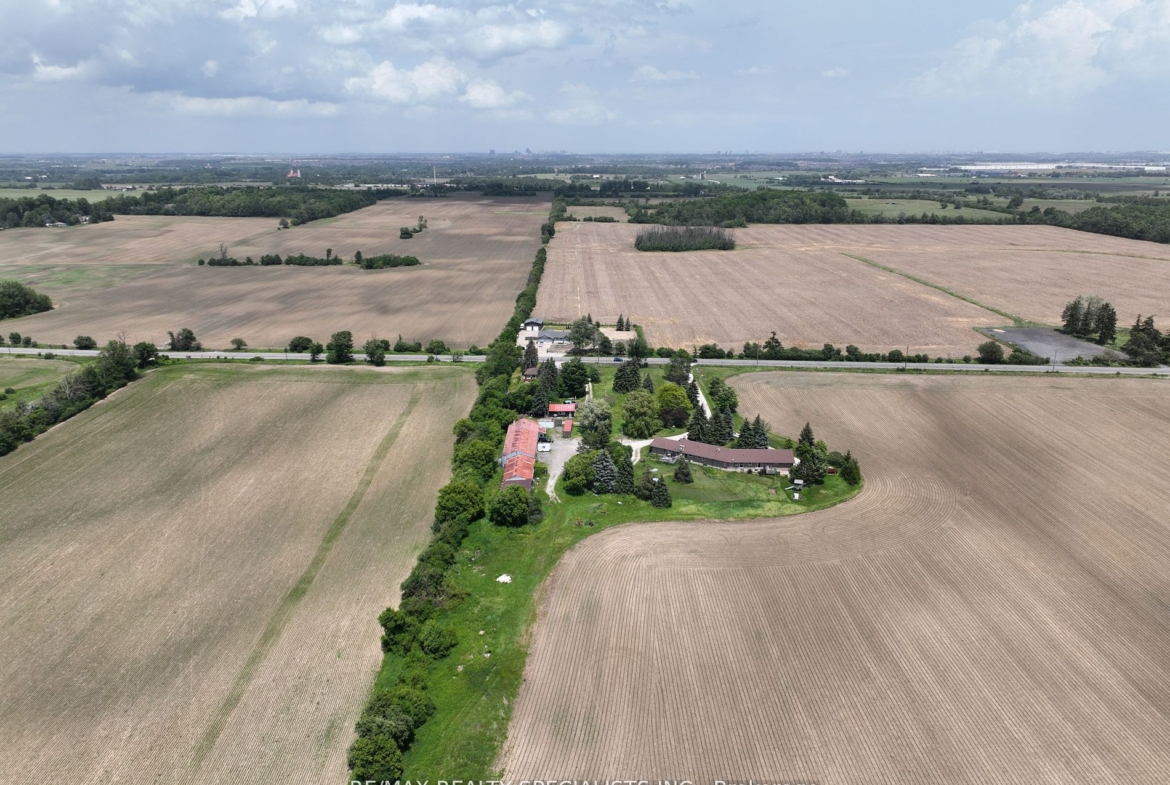 51 acre farm with the view of city skyline: Square One/Mississauga high rises are clearly seen! Located 2km from Mississauga’s border, 2 km from Toronto Outlet Mall, and 1 km from the junction of three highways: Hwy 401, hwy 407 and future approved highway 413. 9th Line will be widened to 4 lanes + sidewalk + bike path in very near future. This is main artery leading to Georgetown. This land is not frozen, as Hwy 413 will veer EAST from the junction of hwy 401/407. Major builders own adjacent tracts of land. Prologis commercial structure was just launched! Manicured front lawn leads to a sprawling brick bungalow with two legal residences: newer south side residence sports a double garage, mud room/laundry room with walk out to deck, very large white country eat-in kitchen with cathedral ceilings, master bedroom with spacious semi ensuite bathroom with jetted bathtub and separate shower. Two more bedrooms. Northside residence has a huge country kitchen, living room with cathedral ceilings and two bedrooms. Beautiful covered porch and a double garage. Ample parking. Large deck and back gardens overlooking farmland and wood stand. Landscaped garden surrounds both houses. There is a saloon themed summer bar in the shade of tree stand. 2000 S.F. shop provides room for business or additional garages. Two new oil tanks in 2016. Well water is plentiful thanks to an underground aquifer to the north at 5th SDRD. Land bankers, investors park your $$$. Farmland is rented to gentleman farmer for soybeans and corn. Both houses rented. If you are looking to build a family compound of unrestricted size and grow your own organic food, while living right in between Mississauga, Oakville, Milton and Georgetown and THREE major highways then you have found the best place ever!
